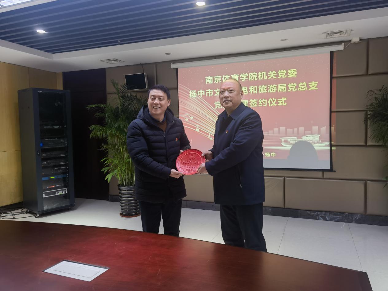 为更好加强基层党建工作,以党建工作凝聚人心、增强力量,促进各项业务工作发展,2月20日下午,南京体育学院机关党委与扬中市文体广电和旅游局党总支党建共建签约仪式在扬中市文体广电和旅游局会议室举行。校机关党委书记王利雅、校教务处处长王凯、校后勤处处长陶利、校工会主席张健、扬中市文体广电和旅游局党组副书记、副局长赵阳、副局长季翔、扬中市文化旅游综合执法大队大队长祝赠荣参加了签约仪式。签约仪式由扬中市文体广电和旅游局办公室主任孙峻主持。