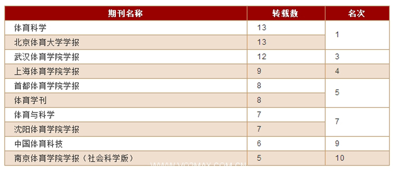 在目前160余种体育类期刊中,2015年度被《复印报刊资料》全文转载的体育类期刊仅有23种,《南京体育学院学报·社会科学版》2015年度共全文转载5篇,在全国体育类期刊中转载数排名第10位,转载率排名第10位,综合指数排名第10位,进入该资料库重要文献转载来源期刊。较之以往,我刊每年仅被转载1-2篇,总量上取得了较大突破,综合指数排名提升明显。
