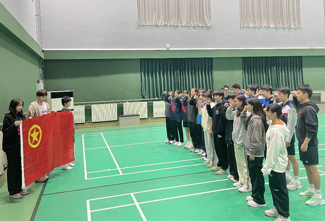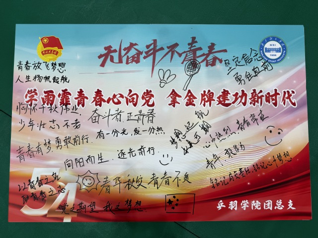 活动开始,乒羽学院团总支书记孙梦晨首先传达了习近平总书记向全国广大青年致以的节日祝贺和诚挚问候,并向大家简要介绍了五四青年节的来历和意义。她勉励大家要严格按照习近平总书记的指示,展现新时代乒羽青年的担当,走好新时代乒羽青年的长征,向“最美巾帼奋斗者”张雨霏学习,让青春在刻苦训练为国争光中焕发出更加绚丽的光彩。随后,全体青年团员一同面向鲜艳的团旗,以最宏亮的声音重温了入团誓词,并在中国共青团团歌《光荣啊,中国共青团》的激昂旋律中郑重写下了自己的“青春誓言”。