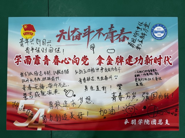 为切实践行习近平总书记对新时代青年的寄语,激励乒羽学院运动员继承和发扬五四精神,5月4日,乒羽学院团总支在乒羽学院党总支的指导下组织开展了“学雨霏青春心向党 拿金牌建功新时代”训练场上的主题团日活动。