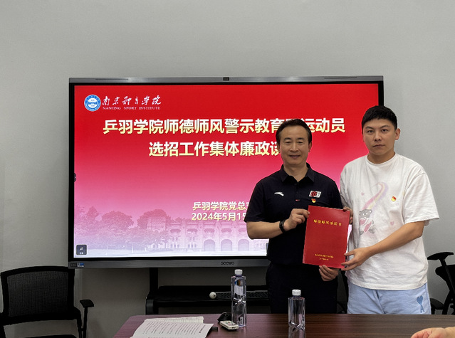 会上,首先徐炳生副院长领学了师德师风失范的典型案例,让在场的管理干部和教练员深刻认识到新形势下加强师德师风建设的重要性、紧迫性,更是给大家规范言行、为人师表等方面敲响了警钟。随后孔庆玮副院长给大家详细解读了《南京体育学院乒羽学院师德师风承诺书》。解读完毕后,全体管理干部和教练员在承诺人位置郑重地签上了自己的名字,并依次向冀方新院长递交了承诺书。紧接着,吴晓明针对2024年省优秀运动队运动员选招工作,同全院管理干部和教练员进行了集体廉政谈话,希望同志们能够以项目和队伍发展为重,以乒羽学院和学校整体形象为重,算清事业、个人、家庭三笔账,走好人生路,自觉严于律己、自觉接受监督、自觉加强自身修养,时刻把纪律和规矩挺在前面,知敬畏、存戒惧、守底线、做表率,千万不要触碰红线和底线。