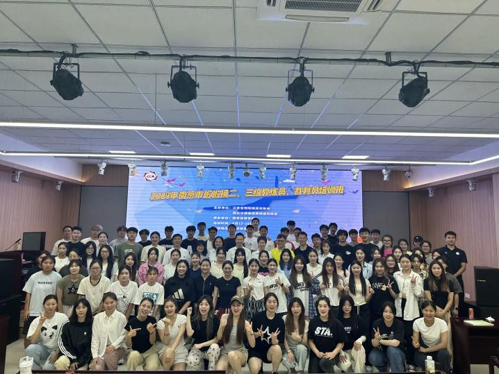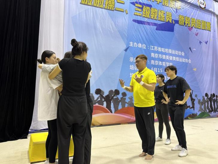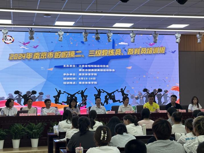 2024年6月15-16日,“2024年南京市啦啦操二、三级教练员、裁判员培训班”在南京体育学院灵谷寺校区多功能报告厅进行,参加本次培训班开班仪式的有中国蹦床与技巧协会啦啦操分会主任、江苏省啦啦操协会会长李育林,武术与艺术学院党总支书记叶瑛、体操系主任吴平平、国家级金牌教师周伯岳以及啦啦操队的各位教练员。本次培训分为理论学习、实践操练、分组创编和考核等环节,共有90余名教师和学生参与。