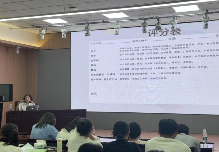 开班仪式结束后,由国际级裁判江山教授从啦啦操的发展历程、啦啦操项目开展方式、团队文化建设、训练注意事项、规则与规程、裁判员职责等方面进行了细致直观的讲解和精心指导。周伯岳老师和蒋敏馨老师分别教授了技巧啦啦操和舞蹈啦啦操的教学与裁判法。通过一天半的理论学习与模拟实操,同学们从总则、评分规则、技巧啦啦操、舞蹈啦啦操等方面加深了对新规则的认识,在教学训练与实践中加深了对技术动作的理解,提高了训练方法的科学性和裁判打分的规范化。