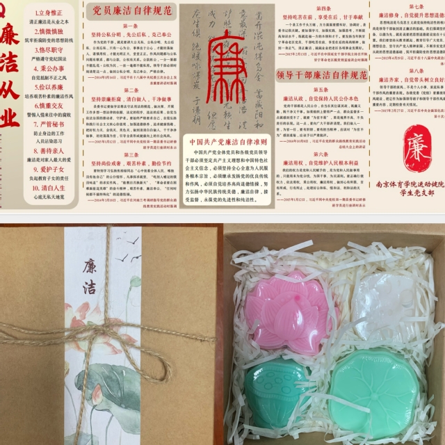 随后与会的领导和老师们向全体毕业生党员赠送廉洁纪念品,一份“清莲皂”,“莲守莲心,不蔓不枝。廉守廉心,香远益清”;一份“口袋廉政”小册子,口袋“小册子”,心中“大尺子”。