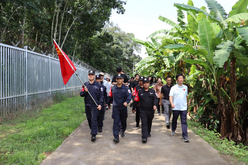 在打洛镇抵边联防所,运动健康学院院长汤强、校团委书记陆春龙、游泳学院党总支书记骆晓娟、运动健康学院党总支副书记阚妮妮带领团队成员实地了解卫国戍边青年的工作情况,与卫国戍边青年亲切交流,分享各自的奋斗故事与不屈精神。陆春龙和骆晓娟两位奥运冠军以自身的奋斗历程为引,与戍边青年讲述了关于梦想、坚持与奉献的故事,鼓励他们在艰苦的环境中不忘初心,牢记使命,激励他们继续发扬“特别能吃苦、特别能战斗、特别能奉献”的优良传统。随后,大家一同踏上边关之路,用脚步丈量祖国的边疆,深刻体会戍边青年的艰辛与荣耀。