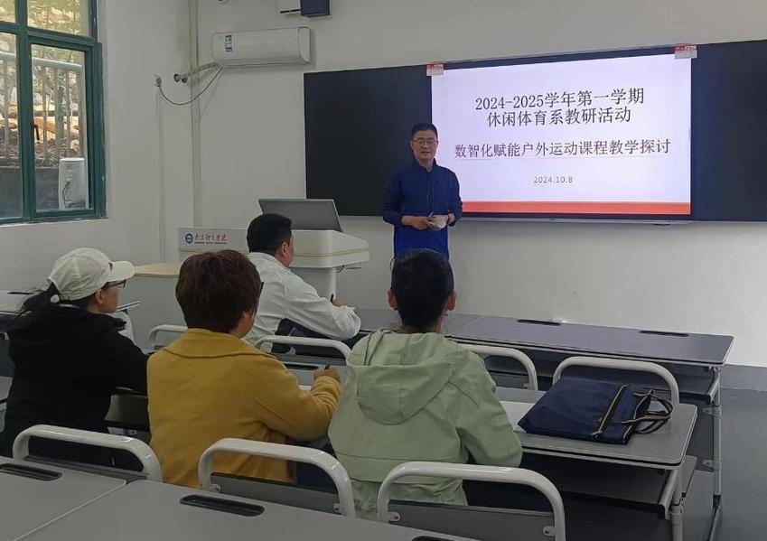 2024年10月8日,体育产业与休闲学院休闲体育系按期开展常规教研活动,阮威老师做题为《数智化赋能户外运动课程教学探讨》的交流报告,休闲体育系全体教师参加研讨。
