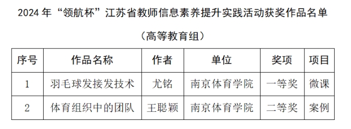 近日,2024年“领航杯”江苏省教师信息素养提升实践活动的获奖作品名单公布。我校推荐的《羽毛球发接发技术》(作者:尤铭)首次在微课项目中荣获一等奖,《体育组织中的团队》(作者:王聪颖)在案例项目中获得二等奖。