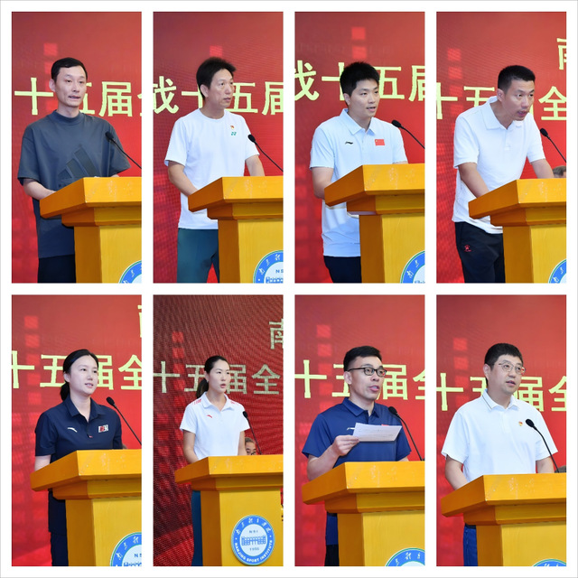 乒乓球队女子一线主教练单明杰、网球队领队姜惟、体操队男子一线教练吕君海、击剑队男子佩剑一线主教练陈滔滔、花样游泳队一线主教练王芳、运动员代表击剑队女子佩剑运动员钱佳睿、科医保障人员代表徐卫华、机关后勤单位代表计划财务处处长丁锴依次作表态发言,从不同岗位、不同角度,体现了各自的责任担当,表达了坚决完成全运会任务的坚强决心,展现了全校上下同心备战、共铸金牌的坚定信念。