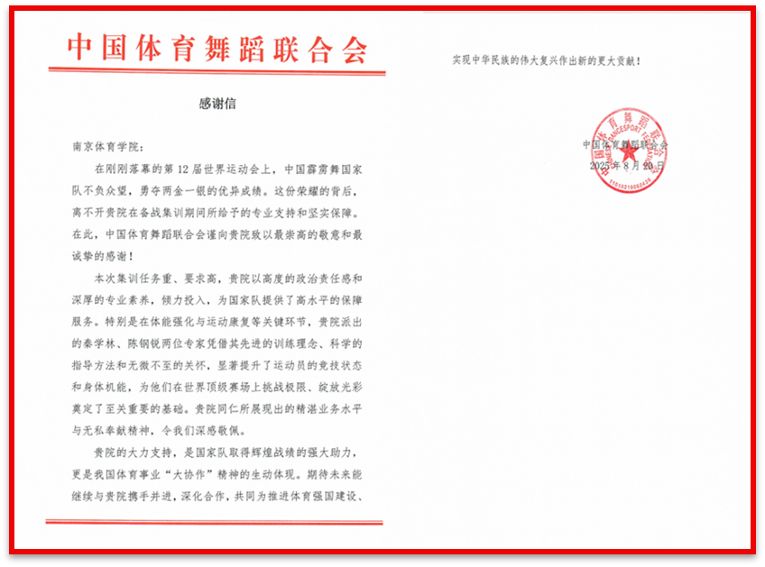 8月20日,国家体育总局社会体育指导中心及中国体育舞蹈联合会向南京体育学院发来感谢信,对中国霹雳舞国家队在成都世界运动会中取得的优异成绩表示高度认可,并对南体所提供的关键支持与坚实保障致以崇高敬意和诚挚感谢。信中还表达了继续深化合作、共同推动体育舞蹈项目普及与发展,促进群众体育繁荣,为体育强国建设贡献更大力量的期望。