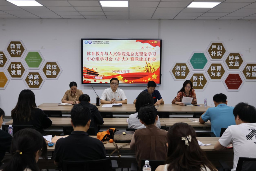 9月17日上午,体育教育与人文学院召开党总支理论学习中心组学习会(扩大)暨党建工作会,会议由党总支书记卢奎主持,党总支理论学习中心组成员、系部副主任、各支部委员参加。