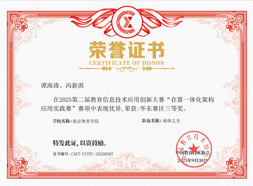 近日,2025第二届教育信息技术应用创新大赛“存算一体化架构应用实践赛”华东赛区获奖名单揭晓。南京体育学院谭海涛、冯新淇老师组成的“南体之光”团队凭借优异表现,荣获华东赛区三等奖,展现了南体教师在信息技术与教育融合创新方面的积极探索与扎实能力。