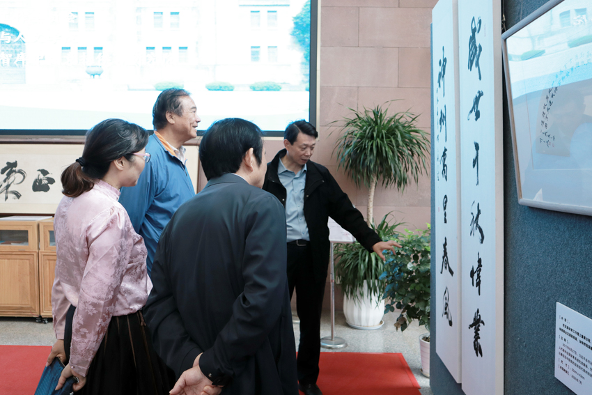 周会长一行还专程观看了“笔书强国梦 墨展体育魂”书法展,校党委常委、宣传部部长、统战部部长许立俊全程陪同接待,向周会长一行仔细讲解学院的历史文化、办学成绩和书法展览的相关情况。