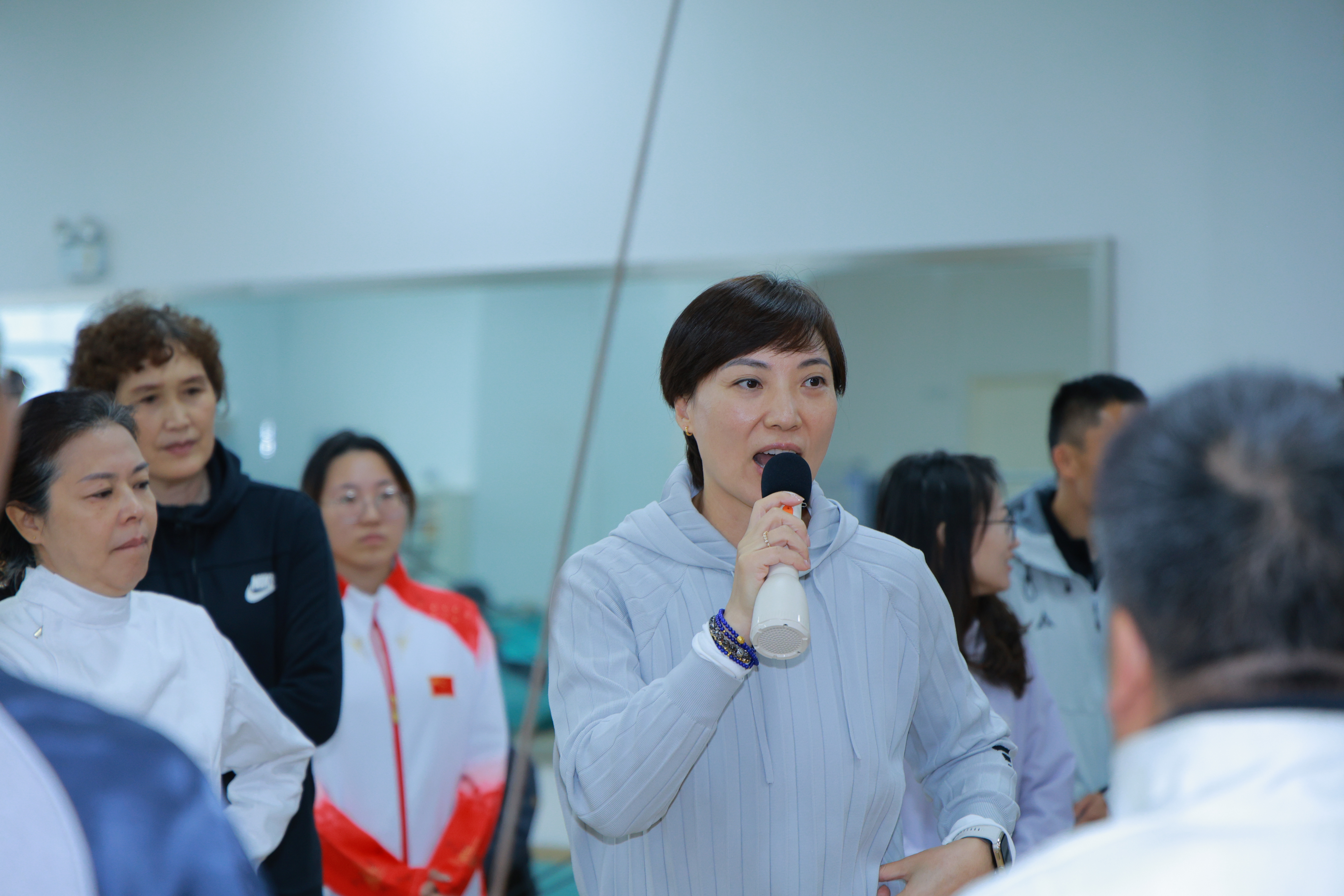活动伊始,击剑专项教师杜韫洁向到场的各位老师介绍了击剑的起源发展、不同剑种的特点等,用生动的讲解为老师们打开击剑文化的大门。随后进入服装体验环节,在击剑专项学生的耐心指导下,老师们逐一穿戴击剑服、面罩与手套,亲手触摸专业装备,直观感受这项运动的严谨与专业。