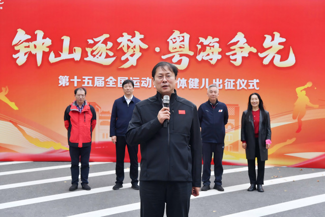 在庄重而热烈的氛围中,副校长刘健向体操队发布出征令。