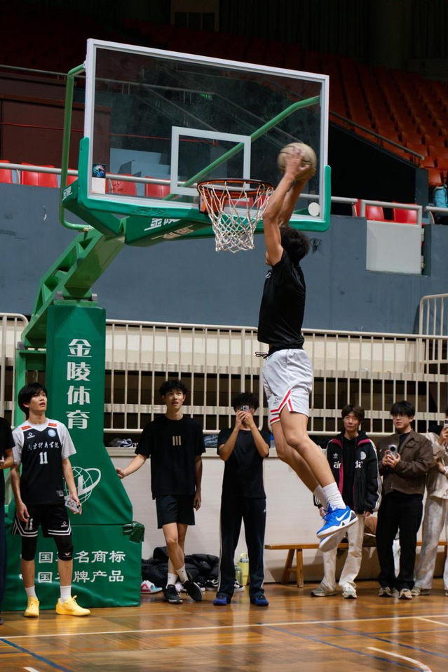傍晚时分的南体体育馆激战正酣,同学们纷纷沉浸在篮球社团“日落接波”活动的热烈氛围中。南京同曦俱乐部总经理王震率领球员郭昊文、黄荣奇、李斌卓、刘奕杭惊喜空降。球员们一句亲切的“不太会打,加一组吧!”瞬间拉近了与同学们的距离,随即投入激烈的对抗中。期间,精彩瞬间不断上演:郭昊文的超远三分应声入网,引来全场惊呼;黄荣奇持球突破后的暴力扣篮,将现场气氛推向高潮;刘奕杭和李斌卓则凭借灵活的脚步与精准的中投,与同学们展开精彩单挑,每一次攻防转换都充满看点。职业球员的专业素养与亲密互动,让同学们近距离感受到了篮球运动的魅力,也为这场南体校园的日常社团活动增添了独一无二的高光时刻。
