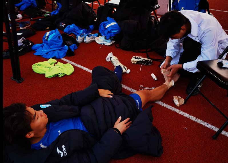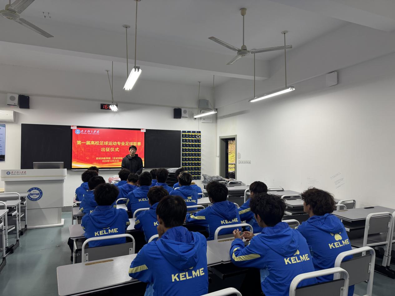 学校领导高度重视本次赛事,党委书记刘红明,党委常委、副校长陈爱国多次到训练现场鼓劲,为团队注入“强心剂”。教练组则以科学训练为核心,制定精准提升方案:主教练魏亮以“专业、精准、高效”的执教理念,设计科学训练体系,即便感冒发烧仍坚持带训,用“轻伤不下火线”的敬业态度诠释专业精神。在精准施策方面,团队针对不同位置球员制定“一对一”提升方案,在不到两个月的时间里,便带领这群零基础的新生完成了从“战术生疏”到“配合流畅”的跨越;助理教练周霏霏牺牲休息时间,逐帧分析比赛视频,纠正技术动作;体能教练吴东华针对足球比赛时长特点,设计专项耐力训练,有效提升了队员的续航能力;运动康复专业教师付乐及研究生王储手把手传授损伤预防技巧,跟队做好康复放松训练,为队员健康保驾护航。