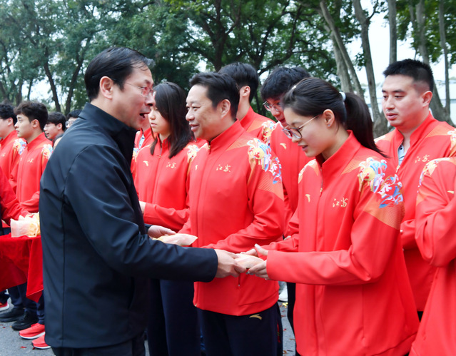 吴兵成表示,全运会是每一位运动员实现梦想、绽放自我的至高舞台,更是检验实力、捍卫荣誉的热血战场。他对游泳队全体出征将士提出三点参赛要求:一是要坚定信心,筑牢夺冠底气。江苏游泳队有着几十年积淀的光荣传统,更有着载入史册的傲人战绩,队中既有张雨霏这样站在世界之巅的顶尖名将,更有董志豪、吕沁遥等冉冉升起的新兴力量,足以让我们满怀信心迎接任何挑战。二是要奋勇拼搏,续写辉煌篇章。希望全体将士秉持“不畏强手、永不言弃”的拼搏精神,在赛场上全力以赴,以最佳状态投入每一场较量,突破极限,再攀高峰。三是要胸怀大局,为省为校争光添彩。希望大家牢记使命、团结一心,在全运会的赛场上展现江苏健儿的卓越风采,用优异的成绩为江苏增光、为母校添彩,更用奋斗的姿态为自己的人生赢得掌声。