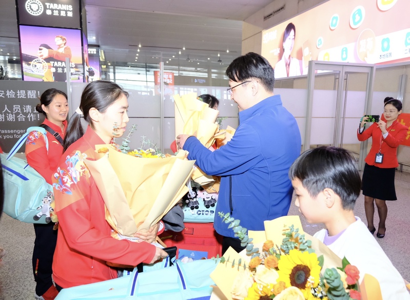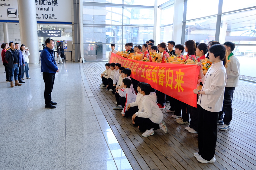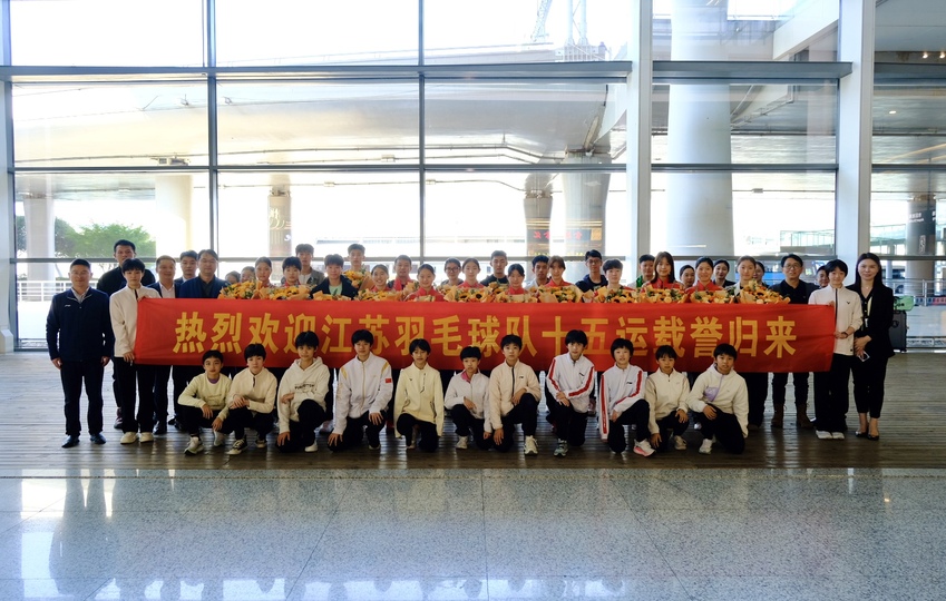 11月14日下午,校党委常委、纪委书记、派驻监察专员刘海宁等到南京禄口国际机场迎接凯旋的江苏省羽毛球队青年运动员们。