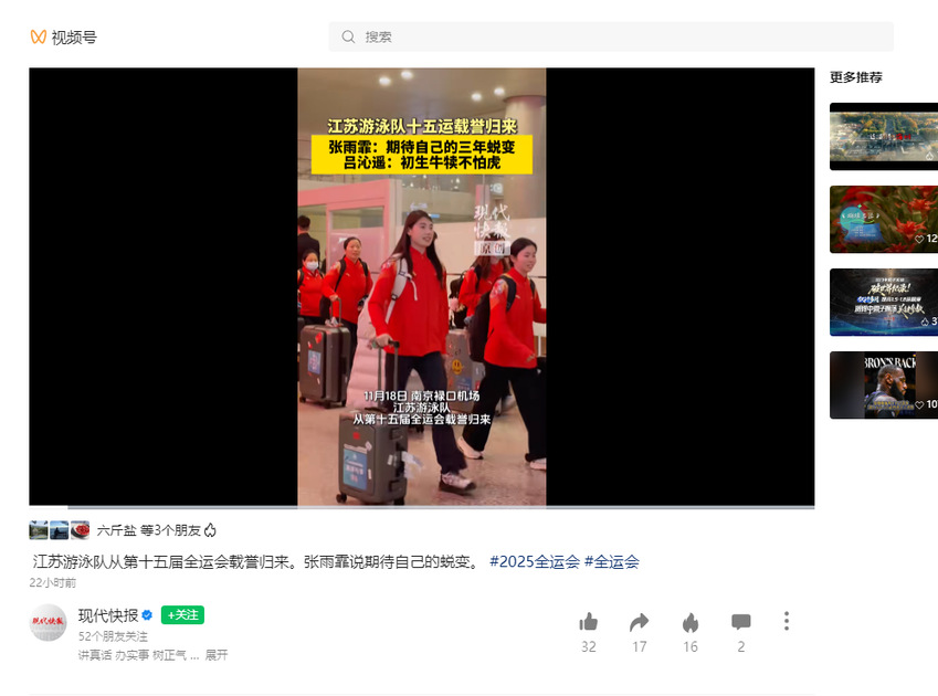 【现代快报】 江苏游泳队从第十五届全运会载誉归来。张雨霏说期待自己的蜕变。