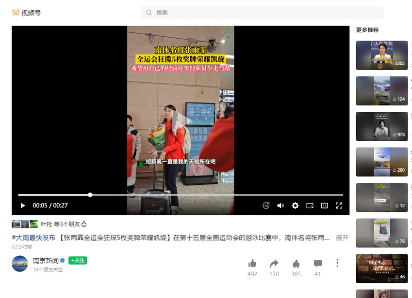【南京新闻】张雨霏全运会狂揽5枚奖牌荣耀凯旋