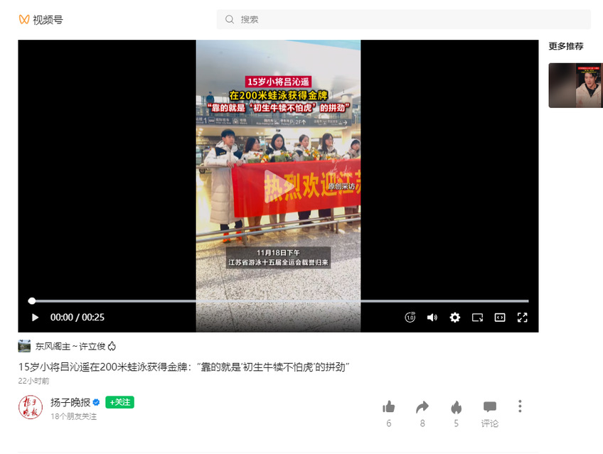 【扬子晚报】15岁小将吕沁遥在200米蛙泳获得金牌:“靠的就是‘初生牛犊不怕虎’的拼劲”