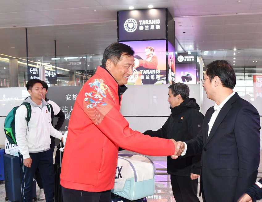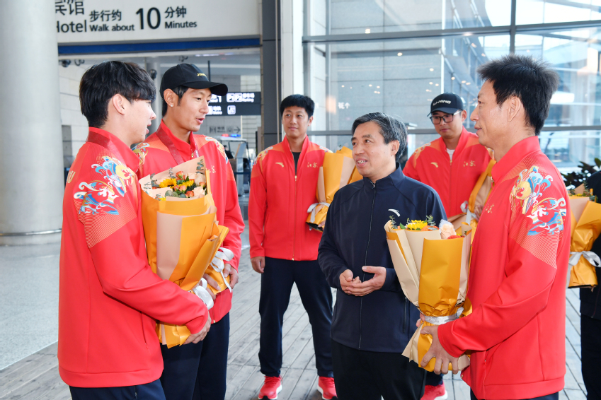 在出站通道处,网球队全体队员受到了来自母校师生的热烈欢迎。参与迎接的领导向全体运动员、教练员和管理保障团队送上了鲜花。刘红明对网球队在第十五届全国运动会中展现的竞技风采给予了高度评价,特别称赞唐盛、孙浅等运动员以优异表现为校争光、为省增光的卓越表现。他希望全体运动员继续发扬体育精神,在未来的国际国内赛场上再攀高峰,为学校和江苏体育事业作出新的更大贡献。