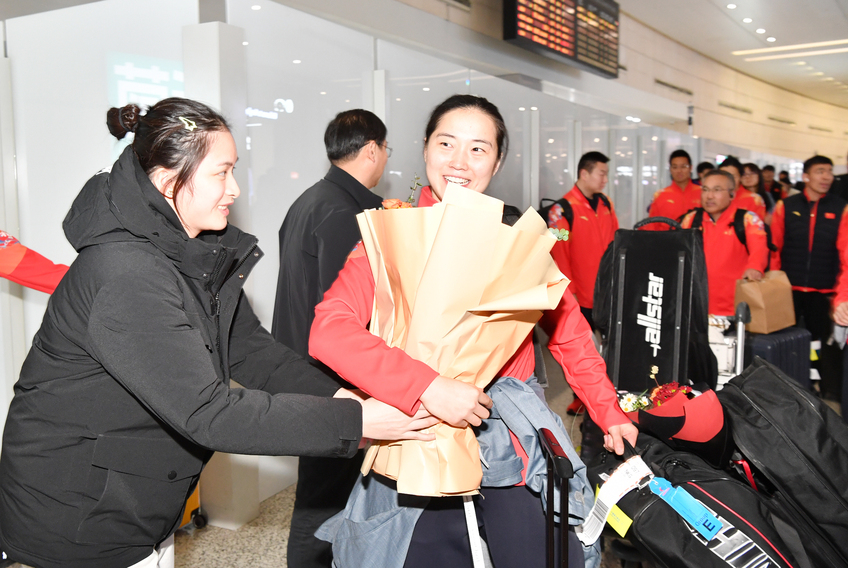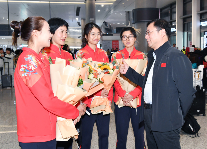 在出站通道处,击剑队全体队员受到了来自母校师生的热烈欢迎。参与迎接的领导向全体运动员、教练员和管理保障团队送上了鲜花。