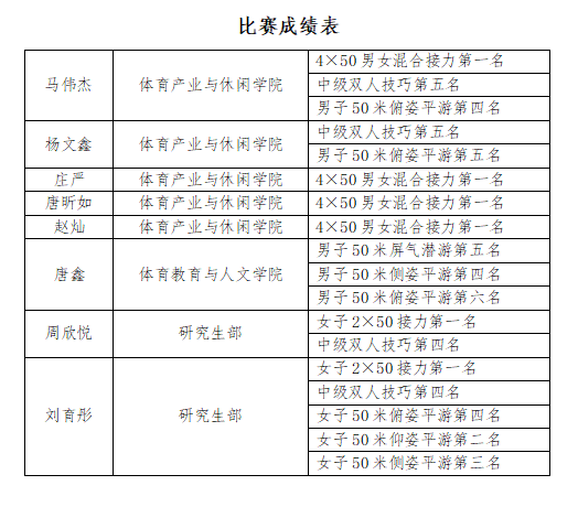 本次比赛由马劼、彭伟和朱乔老师作为教练,研究生部、体育教育与人文学院、体育产业与休闲学院等部门共计8名同学组成的代表队参加本次比赛。代表队共参加了三个大项,九个小项的比赛,在竞速赛(水下潜游、水面平游、双人接力)、混合赛(三人接力、四人接力)和技巧赛(初级、中级)中展现美人鱼运动的无尽魅力。