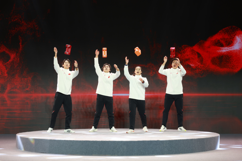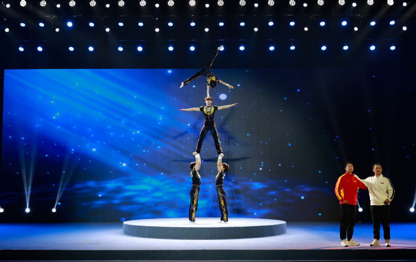 活动开场,我校第十五届全运会体操冠军尤浩、我校第十五届全运会游泳冠军吕沁遥、水上运动中心第十五届全运会赛艇冠军臧哈亮相分享全运荣耀与奋斗历程。本次品牌交流展示活动以“奔赴”为主题,通过《看!这是我们的赛场》《体育的烟火气》《逐梦者的力量》三个篇章,巧妙融合体育特色与艺术形式,将体育舞蹈、花样轮滑、舞狮、武术、石锁等二十余种体育项目纳入情景化演绎,生动展现江苏体育组织蓬勃活力与 “体育让生活更美好” 的幸福图景。其中,南京体育学院武术与艺术学院、体育产业与休闲学院以及篮球社的部分学生参加了表演展示活动。我校技巧队运动员还以情景剧的形式演绎了他们刻苦训练、努力拼搏的故事,展现一代代江苏体育人坚守梦想、为国争光的精神力量。