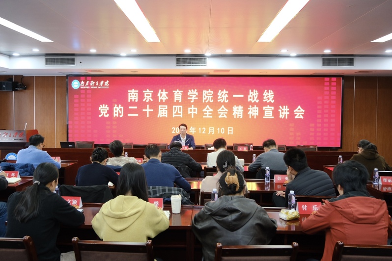 为深入学习贯彻党的二十届四中全会精神,进一步凝聚统一战线共识力量,12月10日下午,南京体育学院统一战线学习贯彻党的二十届四中全会精神宣讲会在行政楼201会议室召开,全校各民主党派基层组织和统战团体代表参加此次宣讲会。