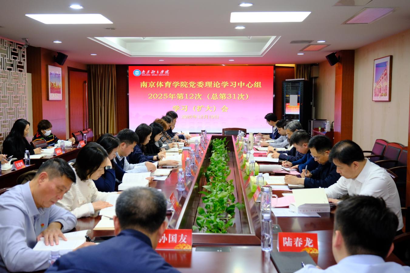 12月10日下午,南京体育学院党委理论学习中心组2025年第12次学习(扩大)会在灵谷寺校区办公楼301会议室召开,围绕《习近平谈治国理政》第五卷开展集中交流学习研讨,校党委书记刘红明主持会议并讲话,校党委理论学习中心组全体成员,各二级党组织书记参加会议。