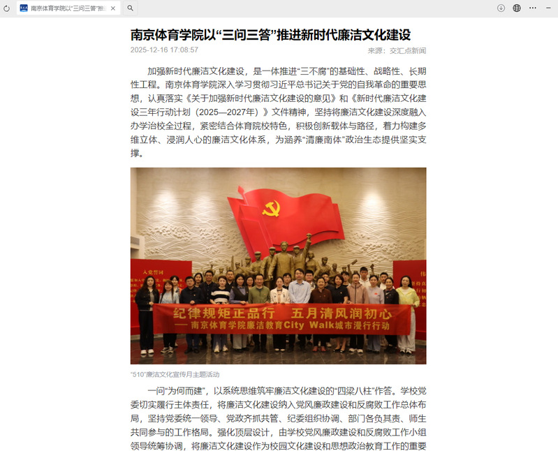 【交汇点新闻】南京体育学院以“三问三答”推进新时代廉洁文化建设