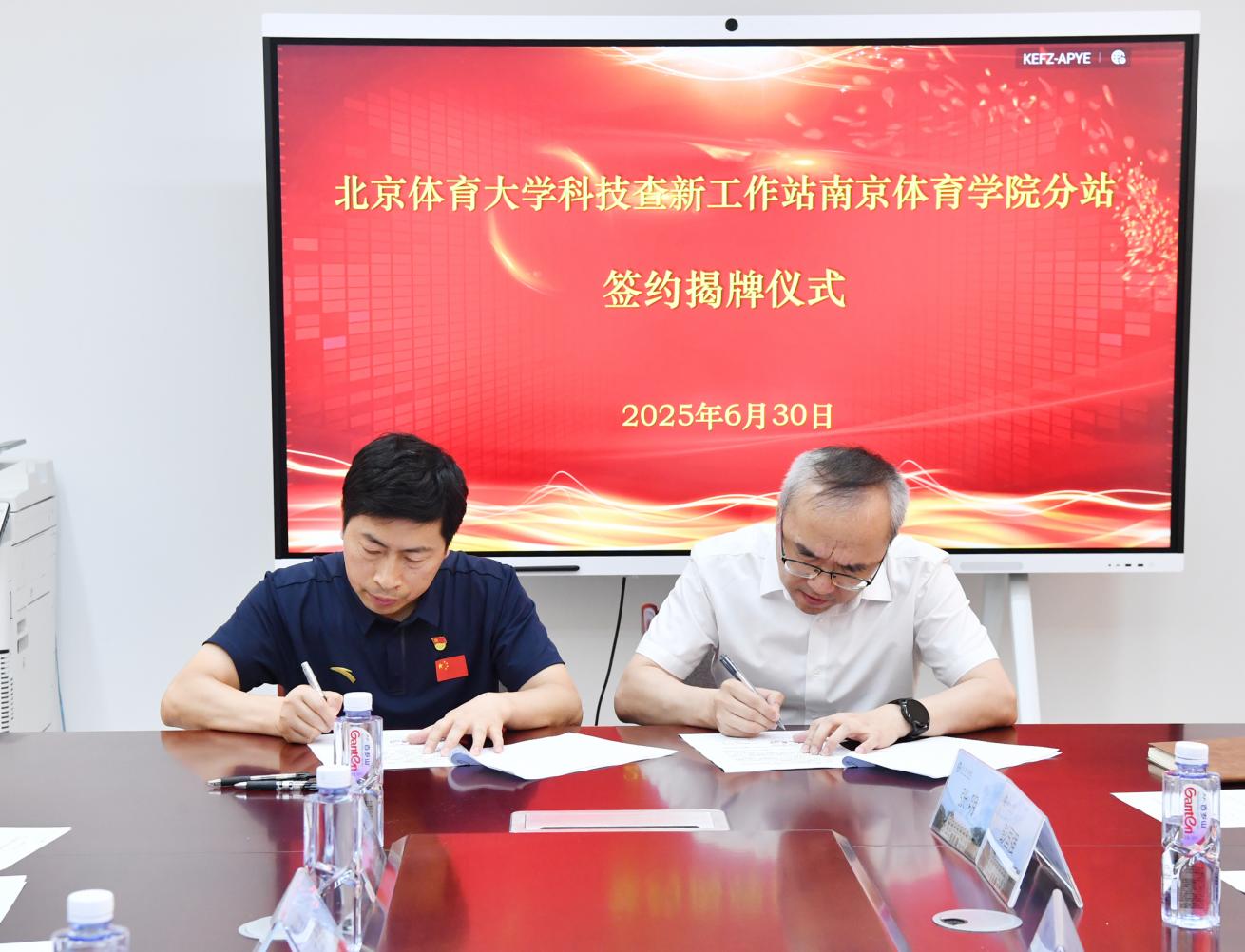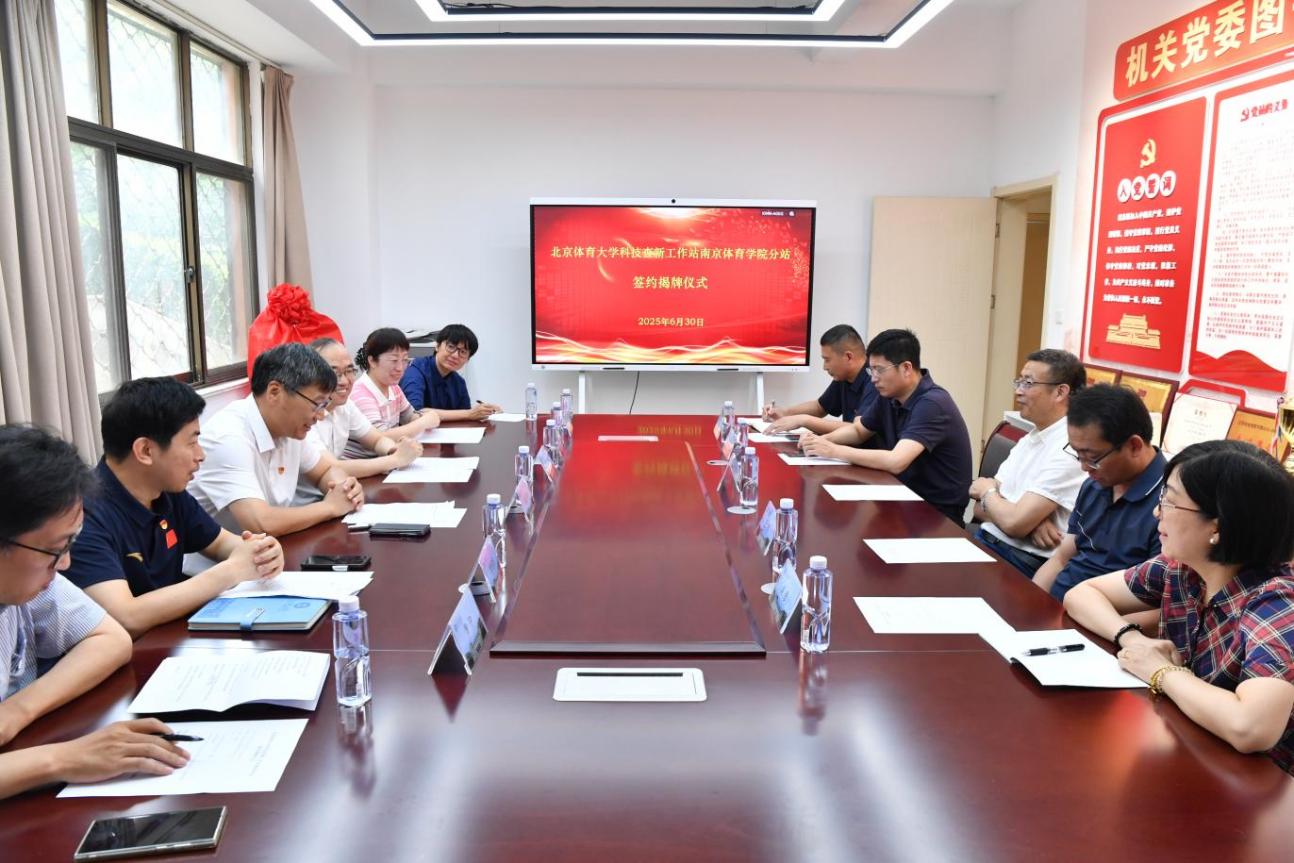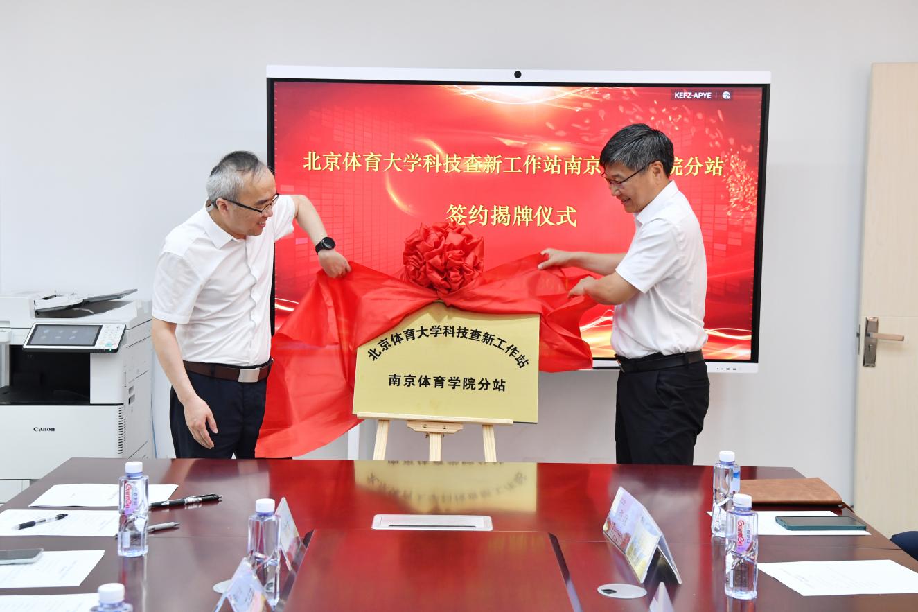 在全体嘉宾见证下,王会寨与李明华作为双方代表签署了合作协议,陈爱国与王会寨共同为“北京体育大学科技查新工作站南京体育学院分站”揭牌。