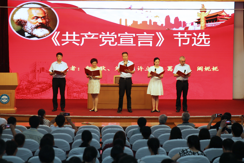 校党委书记、讲师团团长朱传耿率讲师团成员诵读《共产党宣言》(节选)