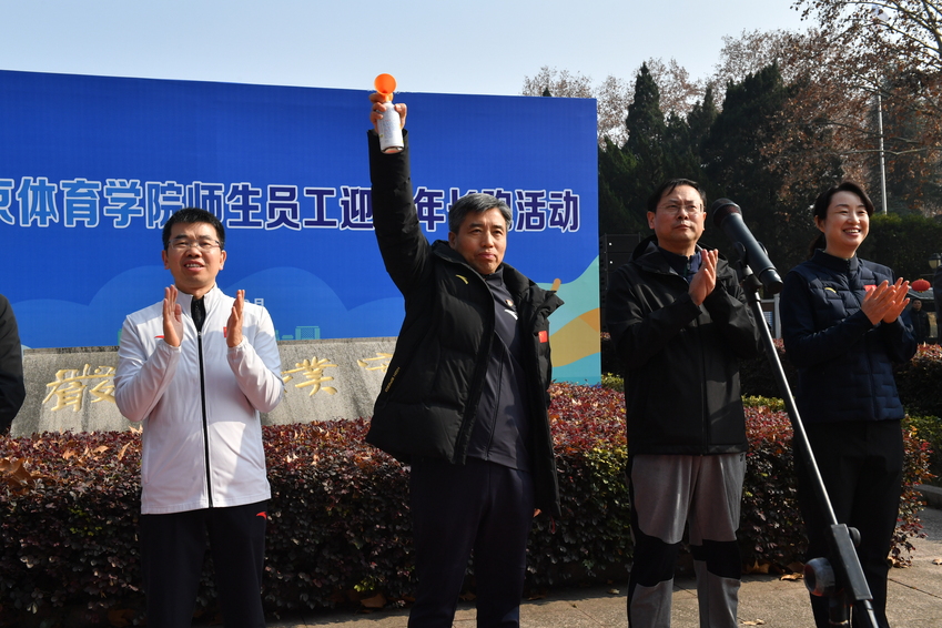 吴兵成在长跑前发表讲话。他表示,回首2025,我们南体人以拼搏奋进的精神,兢兢业业、勤勤恳恳,取得了一系列亮眼的成绩,朝着建设“特色鲜明、走在前列”的高水平体育大学迈出了坚实的一步。十五届全运会上,我们夺得10金、10银、15铜,为江苏代表团稳居全国第一方阵作出了重要贡献。教学科研工作中,我们顺利完成本科教育教学审核评估,国家级教学团队实现突破,学科建设、申博工程有序推进,各类国家级、省部级科研项目和奖项收获丰硕,人才培养质量持续提高。服务保障工作中,学校综合改革走深走实,管理运行更加规范,条件保障质量不断向好,校园文化活动日趋丰富,足球、篮球“校超”赛事如火如荼,教职工文体协会活动广受欢迎,一些大家可感可知的工作举措已经落地见效,还有一些备受关注的重点项目也将陆续迎来突破。