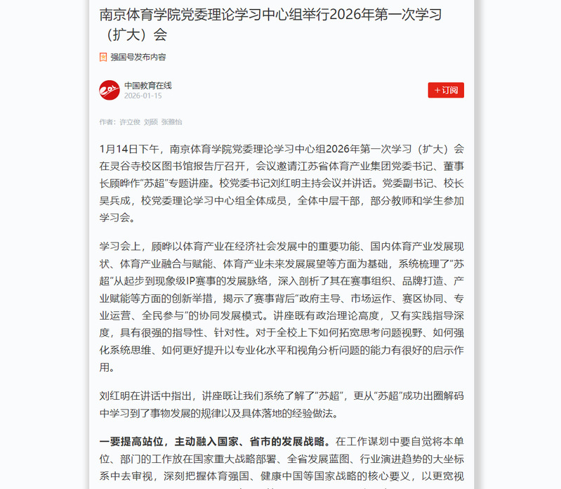 【学习强国】南京体育学院党委理论学习中心组举行2026年第一次学习(扩大)会