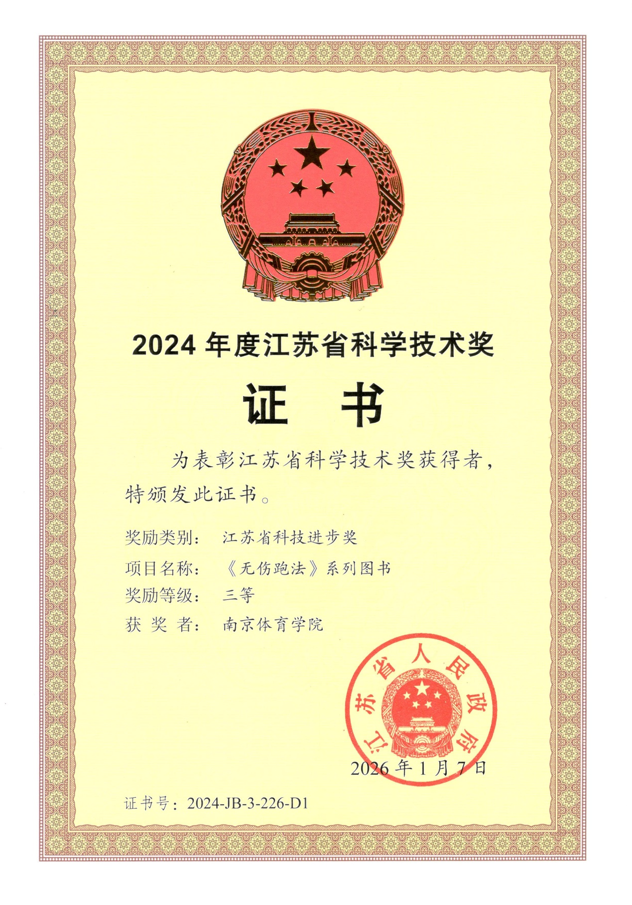 近日,我校教师戴剑松、陈钢锐、顾忠科、杨辰等人共同完成的《无伤跑法》系列图书荣获2024年江苏省科学技术奖三等奖,这是我校在省科技进步奖领域的重大突破,也充分彰显了学校在积极响应和落实国家对于科普工作的最新要求,推动科普与科技创新紧密协同,助力健康中国建设和全民健身事业方面所取得的突出成效。