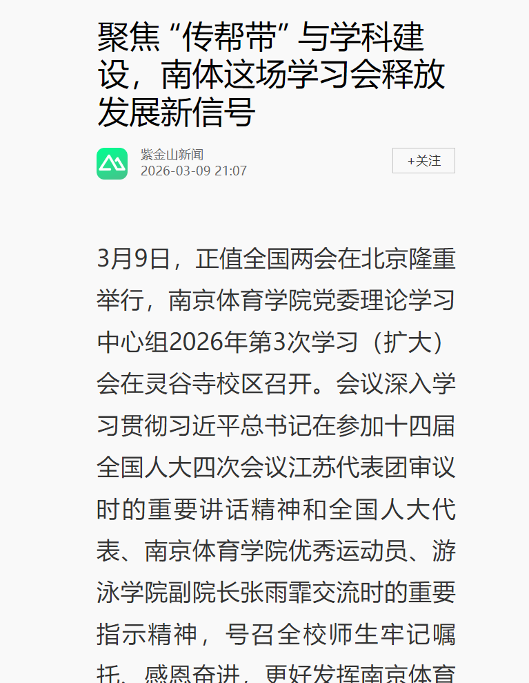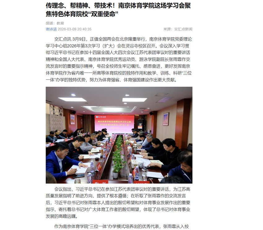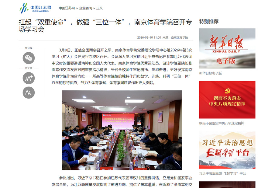 【中国江苏网】扛起“双重使命”,做强“三位一体”,南京体育学院召开专场学习会