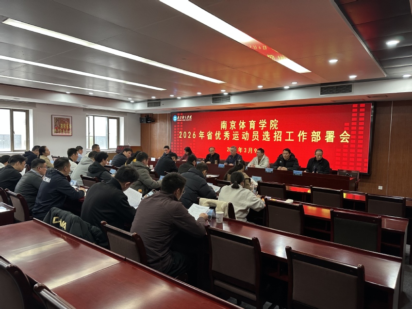 3月9日下午,我校在行政楼201会议室召开2026年度省优秀运动队运动员选招工作部署会。党委常委、副校长刘健出席会议并讲话。纪委办、人事处、训练处、运动康复医院、体育科学研究院、附属学校、团委、各竞技体育二级学院党政负责人、办公室主任、各优秀运动队领队、选招督查专家组专家及训练处全体人员参加会议。
