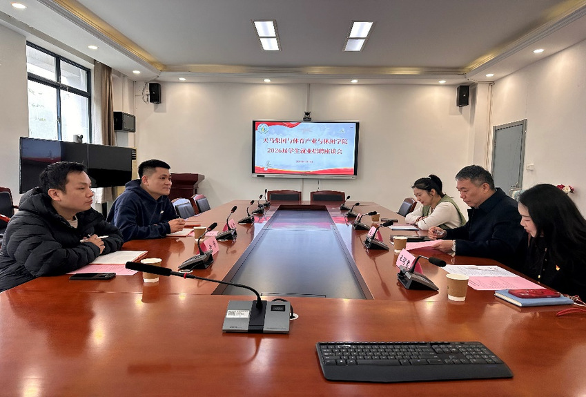 为深化校企合作,搭建优质人才供需对接平台,助力2026届学生高质量就业,3月20日上午,体育产业与休闲学院与天马集团在仙林教学楼A105会议室召开2026届学生就业招聘座谈会。天马集团招聘负责人张帅、招聘部专家徐涛,学院党总支书记王进、副书记王珺君,组织员及辅导员宋佳出席座谈会,会议由王珺君副书记主持。