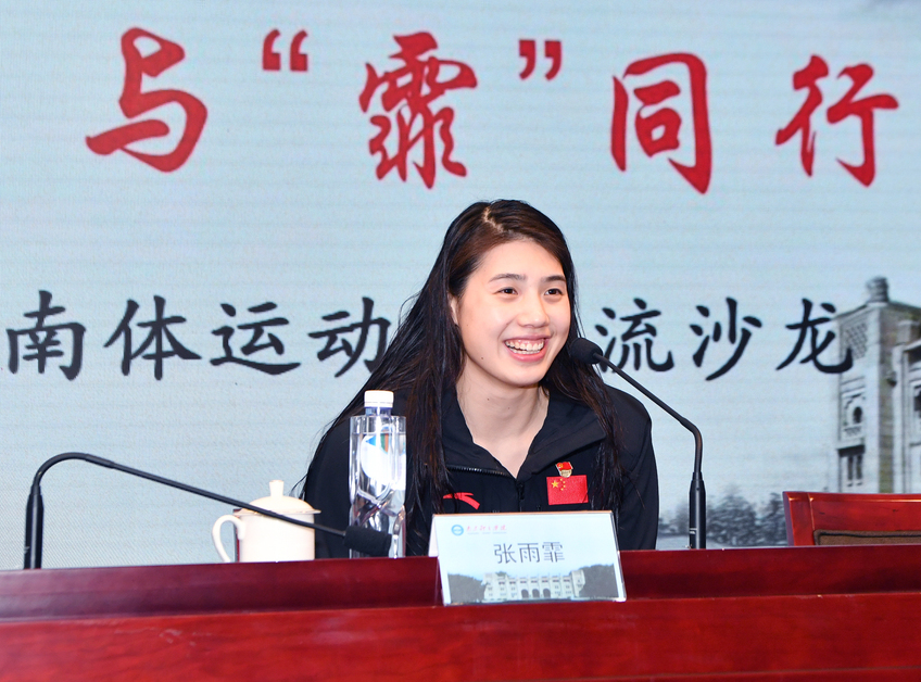 交流环节气氛热烈、互动深入。运动员们踊跃提问,围绕训练瓶颈突破、比赛状态调控、心理压力调适、竞技压力管理等方面坦诚交流困惑。张雨霏耐心倾听,细致解答,结合自身从青涩小将到奥运冠军成长轨迹,分享自己的奋斗历程:她讲述了自己在200蝶项目上的咬牙坚持,日复一日打磨动作的执着与磨砺、逆境中的奋起与突破,生动还原了金牌背后的汗水与泪水。她还系统分享科学训练方法、赛场竞技策略,着重强调强大心理素质是赛场制胜关键,指出团队协同、集体支撑、教练指导的重要意义。最后,她勉励在场运动员:成功没有捷径,唯有坚持与热爱。要永葆对项目的赤诚热爱,勇于直面困难与挑战,保持积极乐观心态,不断突破自我、追求卓越,把热爱化为动力,把坚持化作成绩。