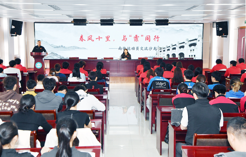 为深入学习贯彻全国两会精神,弘扬中华体育精神,引导全体运动员以先进榜样为标杆,坚定理想信念,4月2日上午,我校在行政办公楼101会议室举办张雨霏与运动员交流沙龙活动,全国人大代表、奥运冠军、我校优秀运动员张雨霏回到母校,与在校运动员面对面交流,答疑解惑,传递奋进力量。活动由校党委常委、副校长刘健主持。校有关部门负责人、管理干部及运动员代表参加活动。