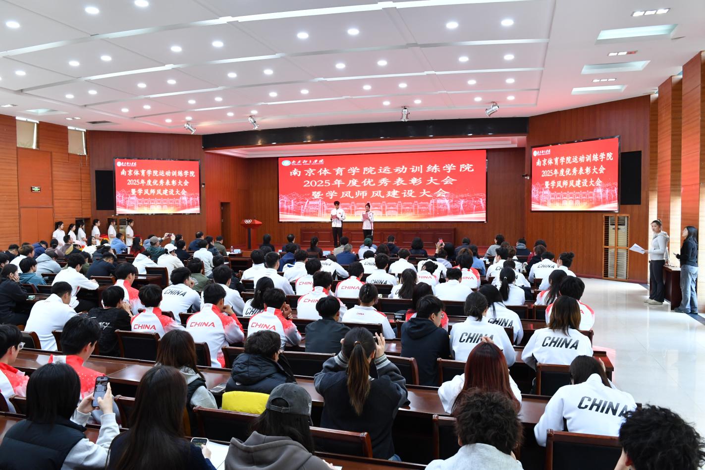 为表彰先进典型、弘扬优良学风师风、凝聚全院师生奋进力量,进一步推动运动训练学院教育教学、训练竞赛等各项事业高质量发展,4月7日下午,南京体育学院运动训练学院在仙林校区多功能厅隆重召开2025年度优秀表彰大会暨学风师风建设大会。校党委副书记、校长吴兵成出席会议,运动训练学院领导班子成员、全体教师及各班学生代表参加会议。
