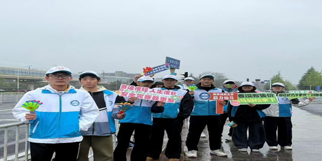 赛事期间春雨淅沥,赛道湿滑,我校志愿者们始终精神饱满、热情高涨。在赛道旁的服务点位,志愿者身着蓝白志愿马甲,手持创意应援牌,以灿烂的笑容为每一位跑者加油鼓劲。“站在赛道上,你已经是千里挑一的存在”“青春没有售价,仙马轻松拿下”,一句句青春标语搭配暖心笑容,成为风雨中最动人的风景。雨水打湿帽檐、凉意浸透衣衫,志愿者们始终坚守岗位,用笑容为跑者注入精神动力,以实际行动诠释志愿精神的深刻内涵。