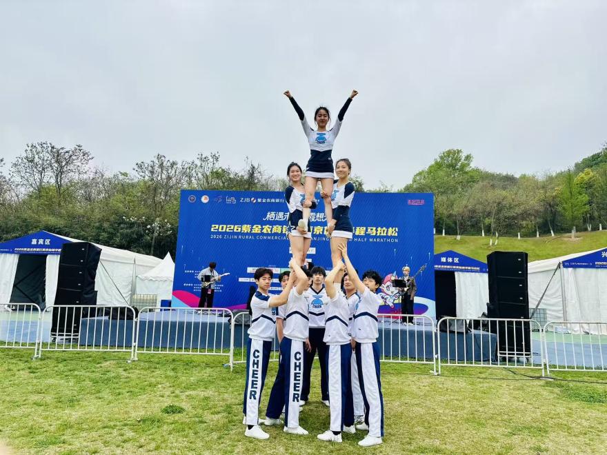 4月12日,2026南京仙林半程马拉松在南京仙林大学城羊山公园鸣枪开赛,南京体育学院啦啦操队作为特邀展演队伍,带来精彩活力的表演,为赛事全程助威。