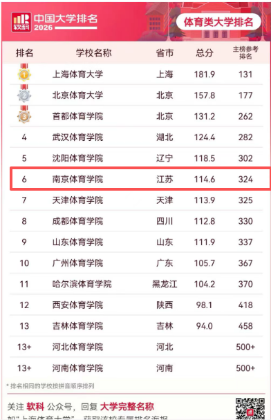 4月15日,高等教育专业评价机构软科正式发布“2026软科中国大学排名”。我校总分达到114.6分,本年度软科主榜位列第324名,较2025年第352名,提高8位。体育类大学位列第6名,较2025年第8名,提高2位。