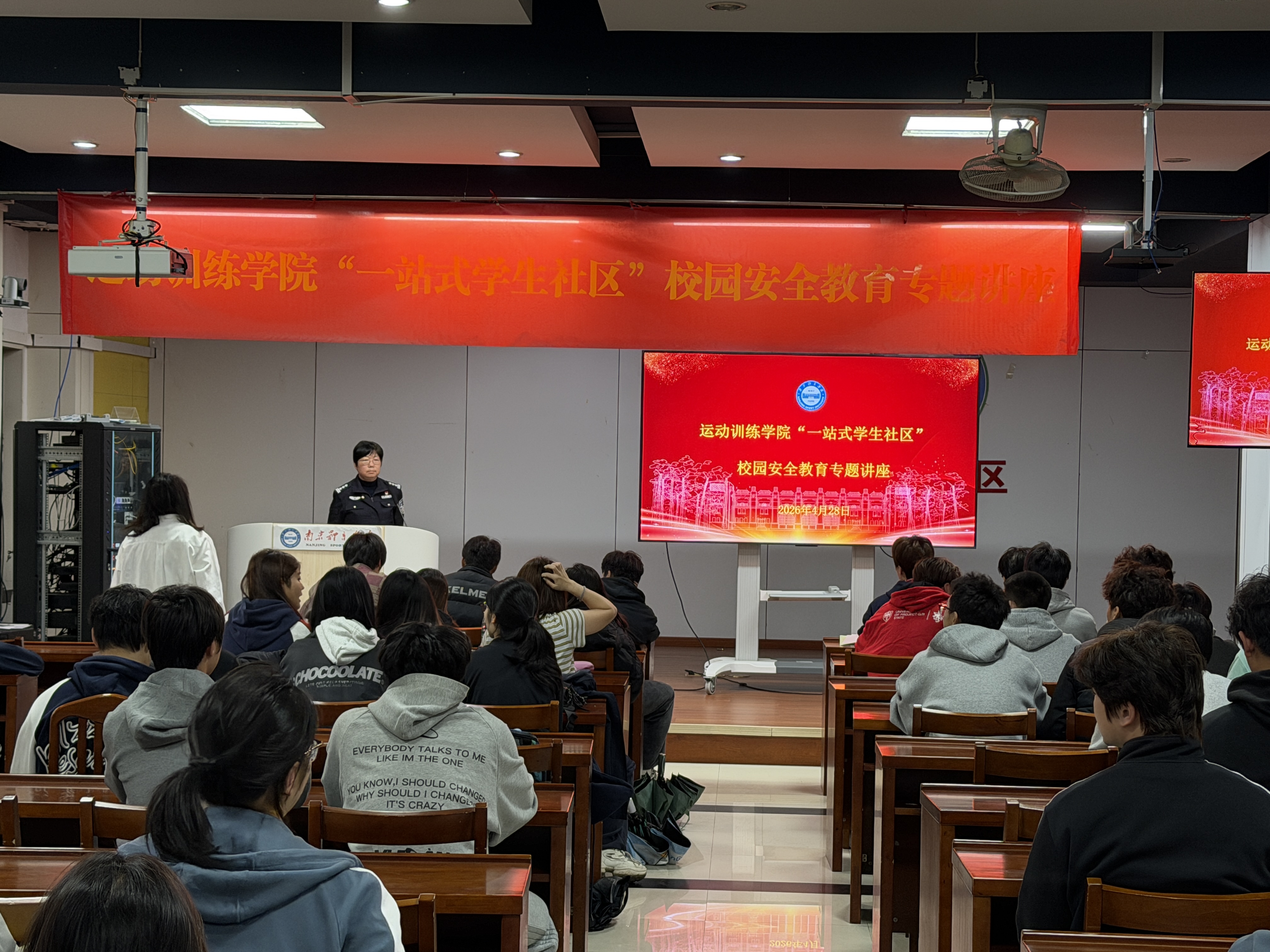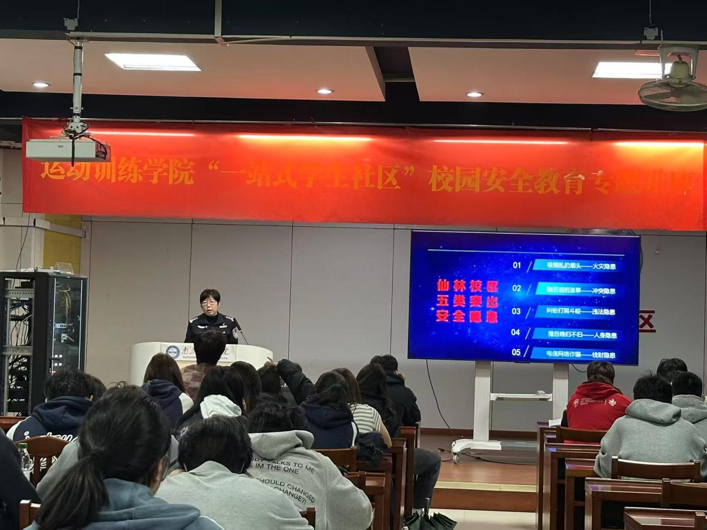 为强化校园安全管理,筑牢学生安全防护屏障,提升安全防范与自我保护能力,营造平安和谐的校园育人环境,4月28日,南京体育学院运动训练学院于大学生活动中心,举办“一站式学生社区”校园安全教育专题讲座。本次讲座特邀南京市公安局栖霞分局驻仙林片区的郭萍警官主讲。