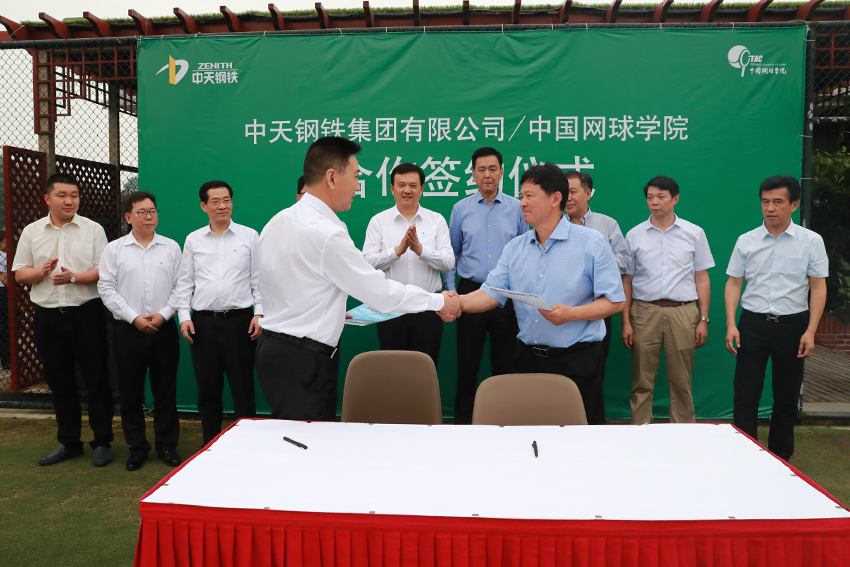 在众人见证下,高一平与蒋宏伟共同签订了战略合作协议书,这标志着中国网球学院与中天钢铁集团有限公司正式成为战略合作伙伴关系。