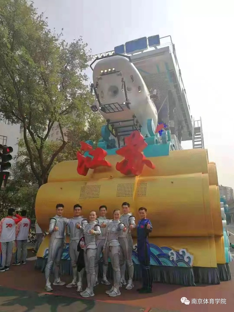 在江苏巡礼彩车上进行展演的表演者中,7位来自南京体育学院,分别是南体技巧队的郭培、付智、张峻硕、王宗南、吴旭升、孟洁,以及艺术体操队的熊佳妮。经过两个多月的艰苦排练,七名运动员圆满完成了表演任务,既展示了南体健儿的魅力英姿,又展示了江苏人的无限风采。
