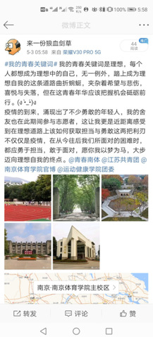 为响应团中央开展“绽放战疫青春 坚定制度自信”主题宣传教育实践活动的安排部署,贯彻落实习近平总书记给北京大学援鄂医疗队全体“90后”党员的回信精神,纪念五四运动一百零一周年,继承和发扬光荣传统,运动健康学院团委于五四期间开展“绽放战疫青春 坚定制度自信”系列活动,激发和凝聚广大团员在抗疫工作中的精神力量,引领团员青年在决胜全面建成小康社会和“强富美高”新江苏建设进程中贡献青春力量。